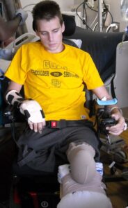 From Germany, Joshua was transported back to the U.S. to Bethesda National Medical Center, Maryland, where he underwent 20 different surgeries, including multiple amputations, losing both legs and part of his right hand. Joshua also battled pneumonia. He would remain hospitalized there for two and a half months, enduring excruciating therapies between his surgeries. Joshua was eventually transferred to Balboa Naval Medical Center, San Diego. While in the amputee rehab program there, Joshua stood on his new legs for the first time on September 5, 2011, nearly four months after the explosion. He spent the next 12 months learning to walk and to drive his adapted vehicle.